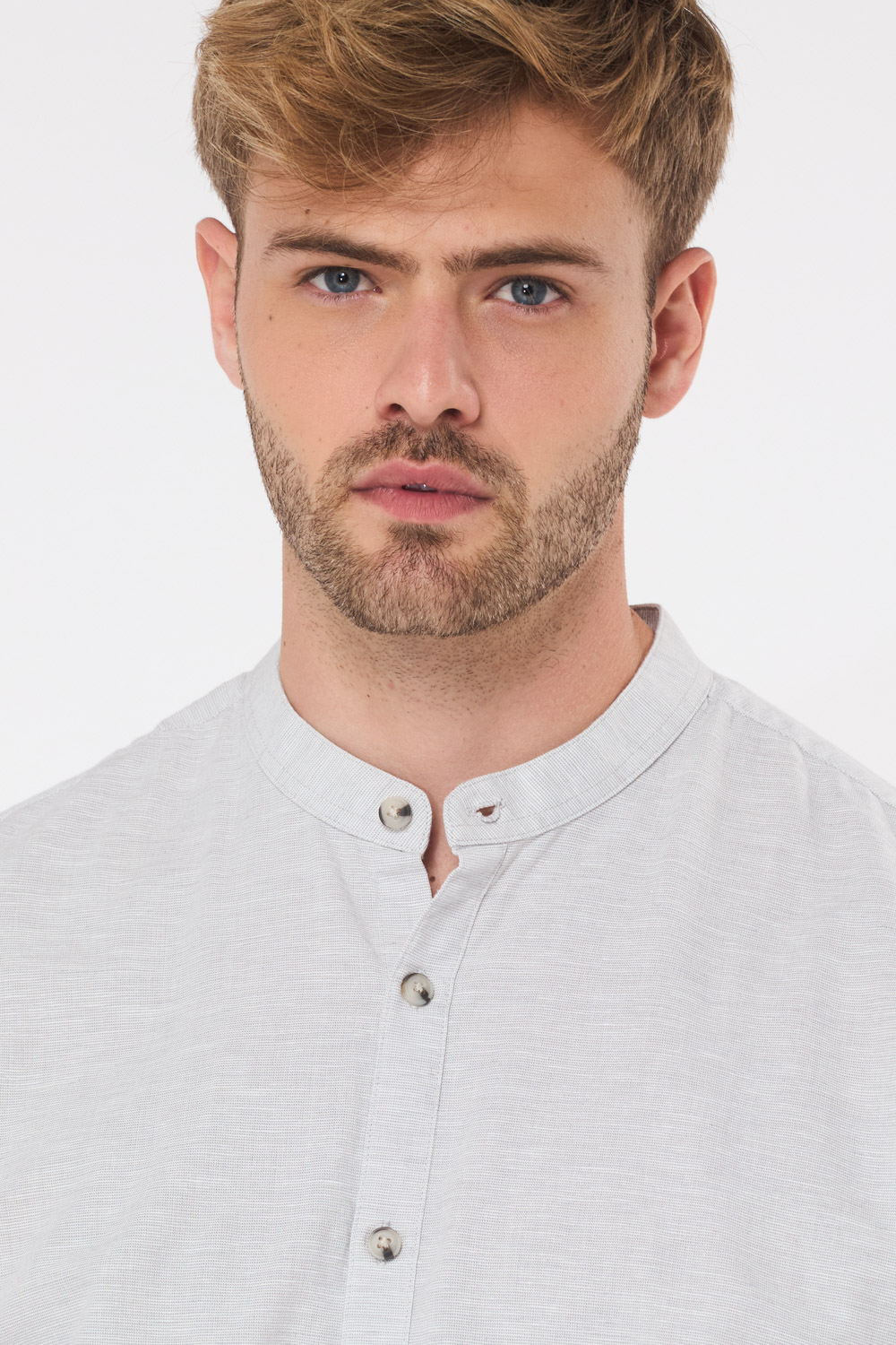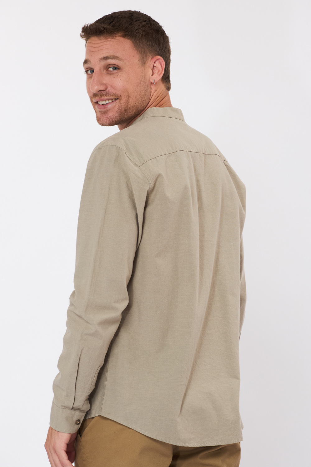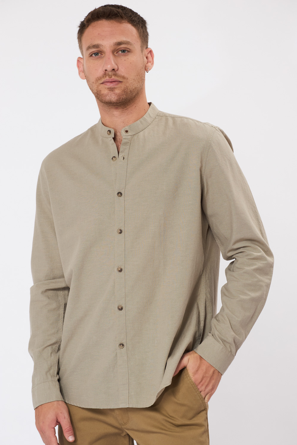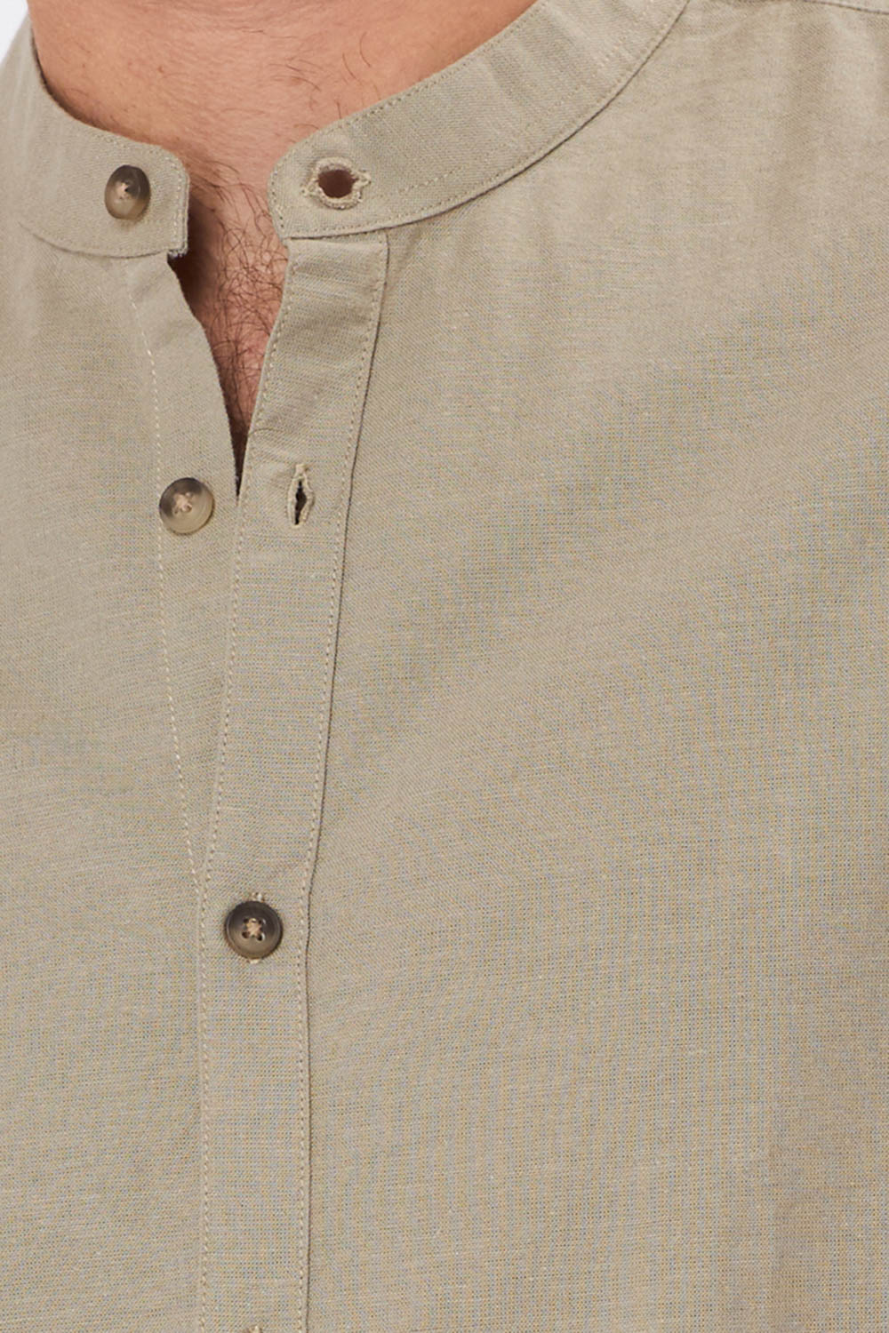 חולצה מכופתרת צווארון סיני בשילוב פשתן - זית