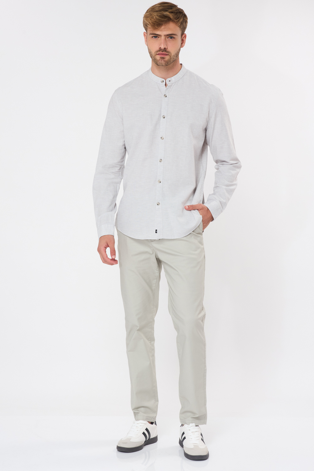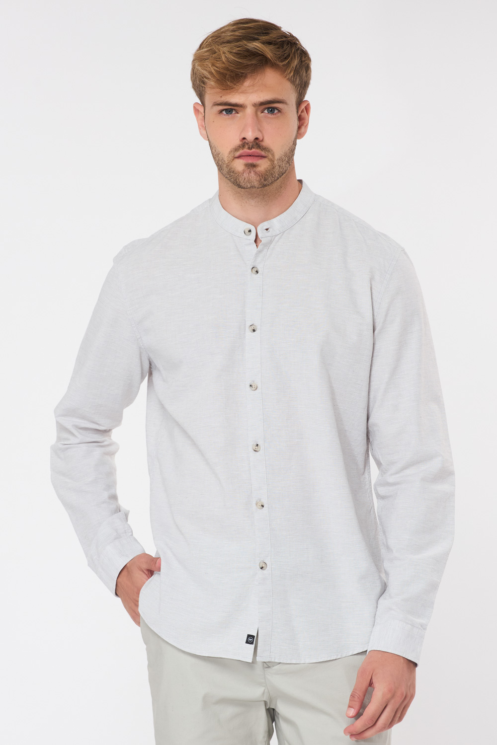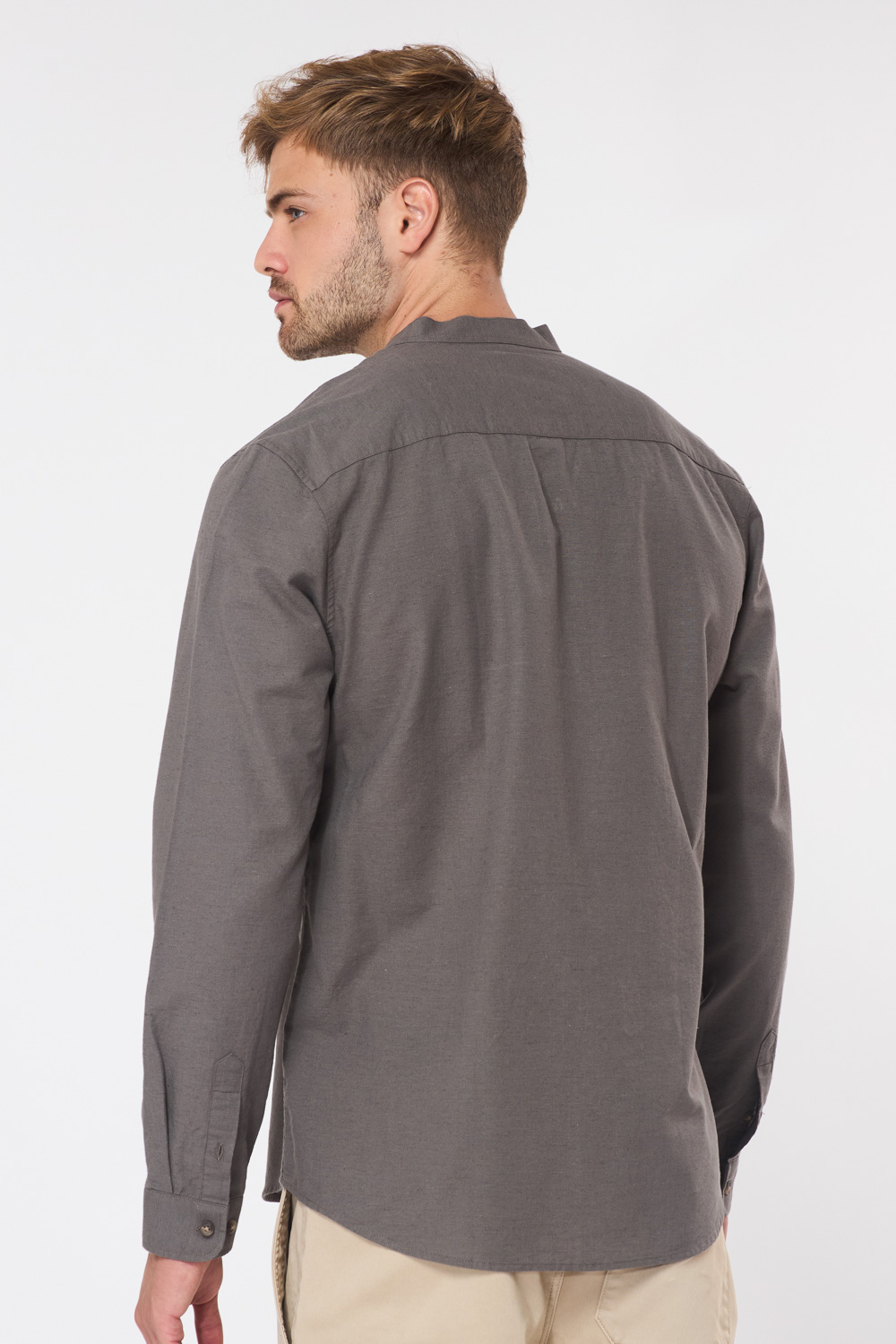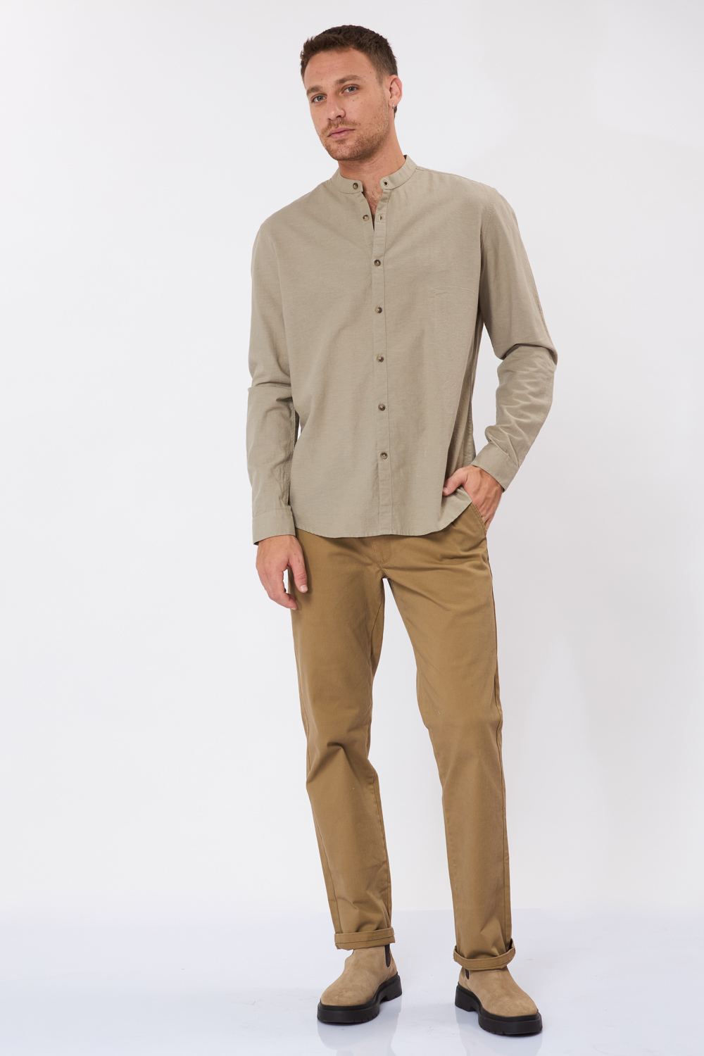 חולצה מכופתרת צווארון סיני בשילוב פשתן - זית