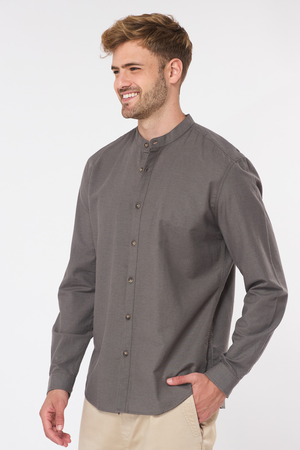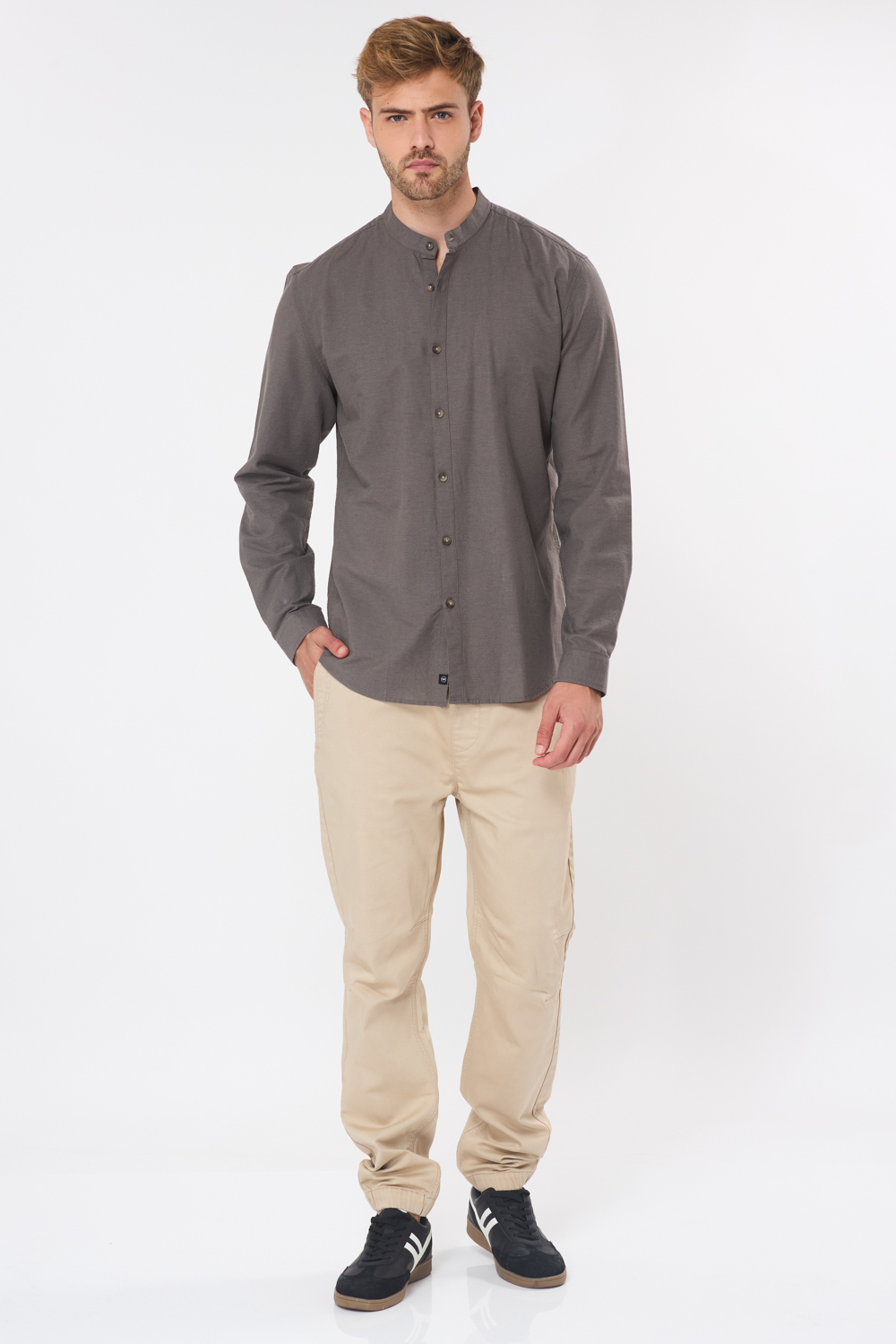 חולצה מכופתרת צווארון סיני בשילוב פשתן – חום