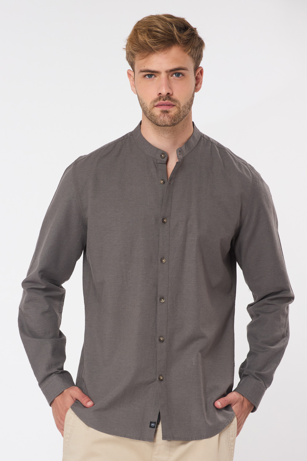 חולצה מכופתרת צווארון סיני בשילוב פשתן - חום