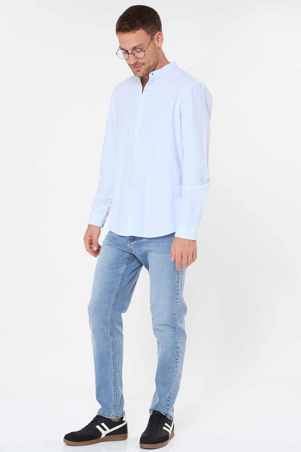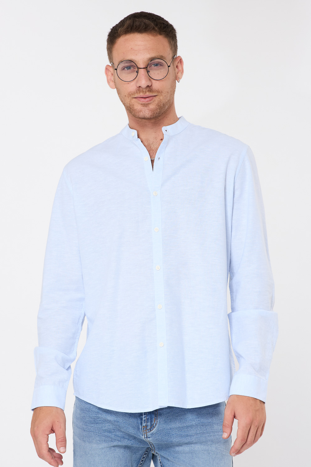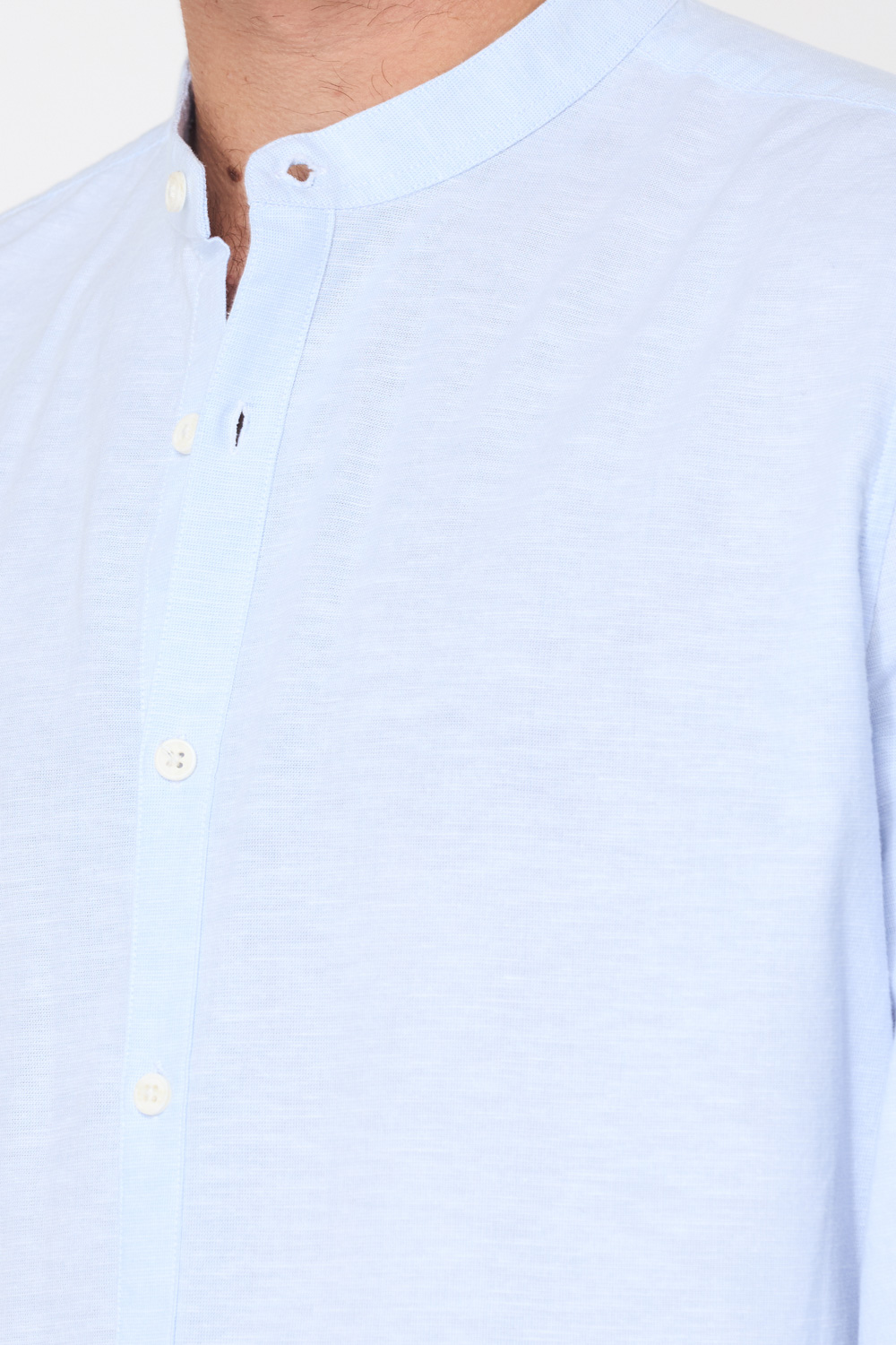 חולצה מכופתרת צווארון סיני בשילוב פשתן - תכלת