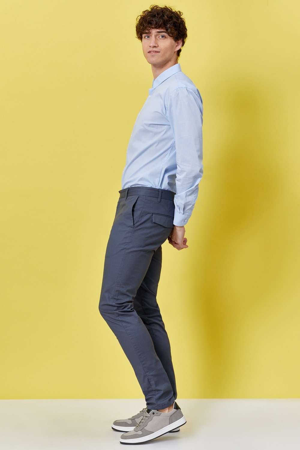 | חולצה מכופתרת בד תכלת עם טקסטורה גזרה רגילה standard fitהרכב בד: 71% כותנה, 25% ניילון, 4% ספנדקס גובה דוגמן: 192 ס"מ מידה דוגמן: L |