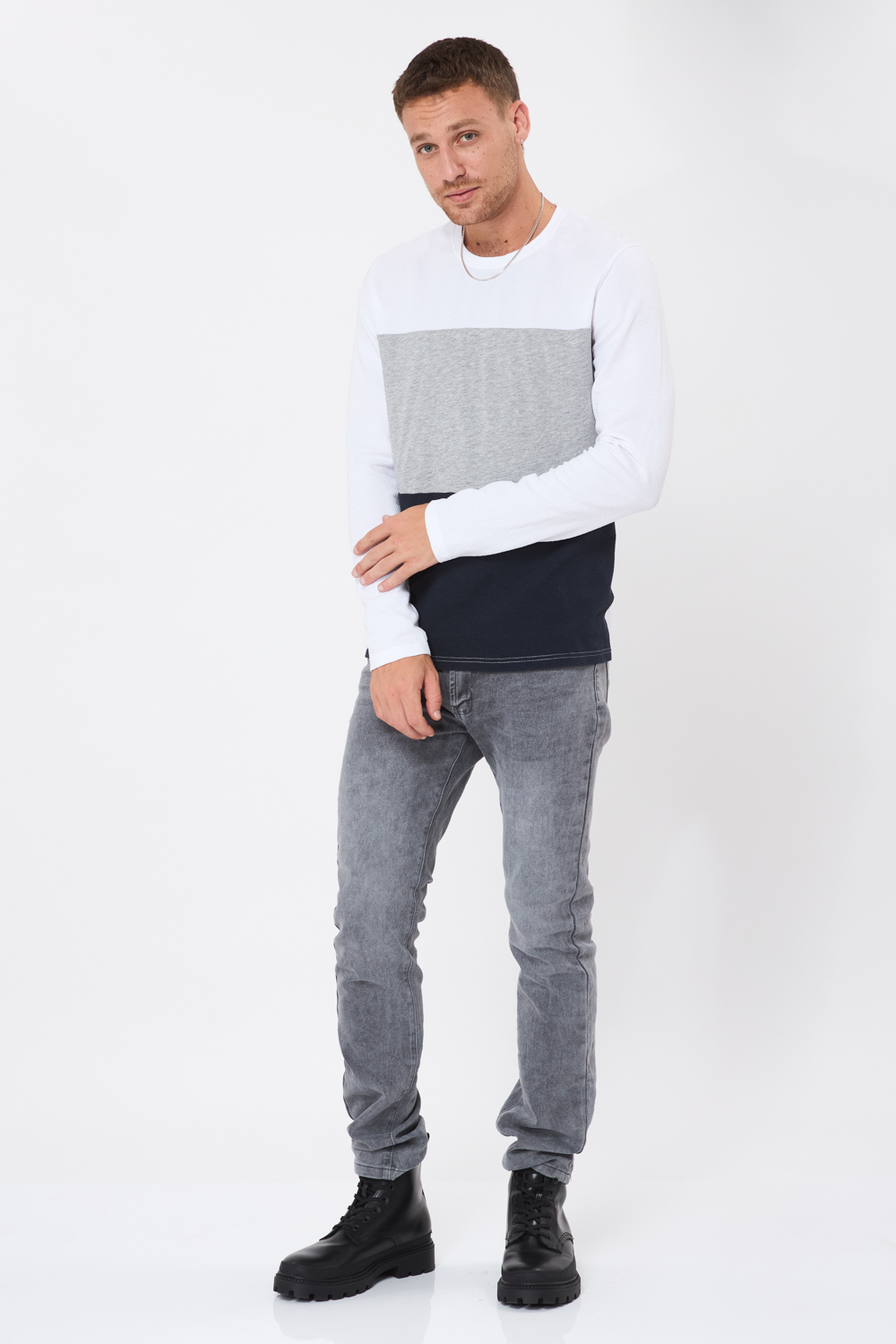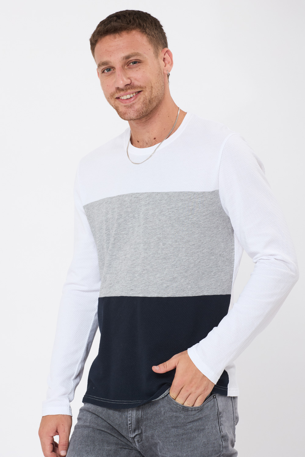 טי פופקורן קולור בלוק – לבן/אפור/שחור