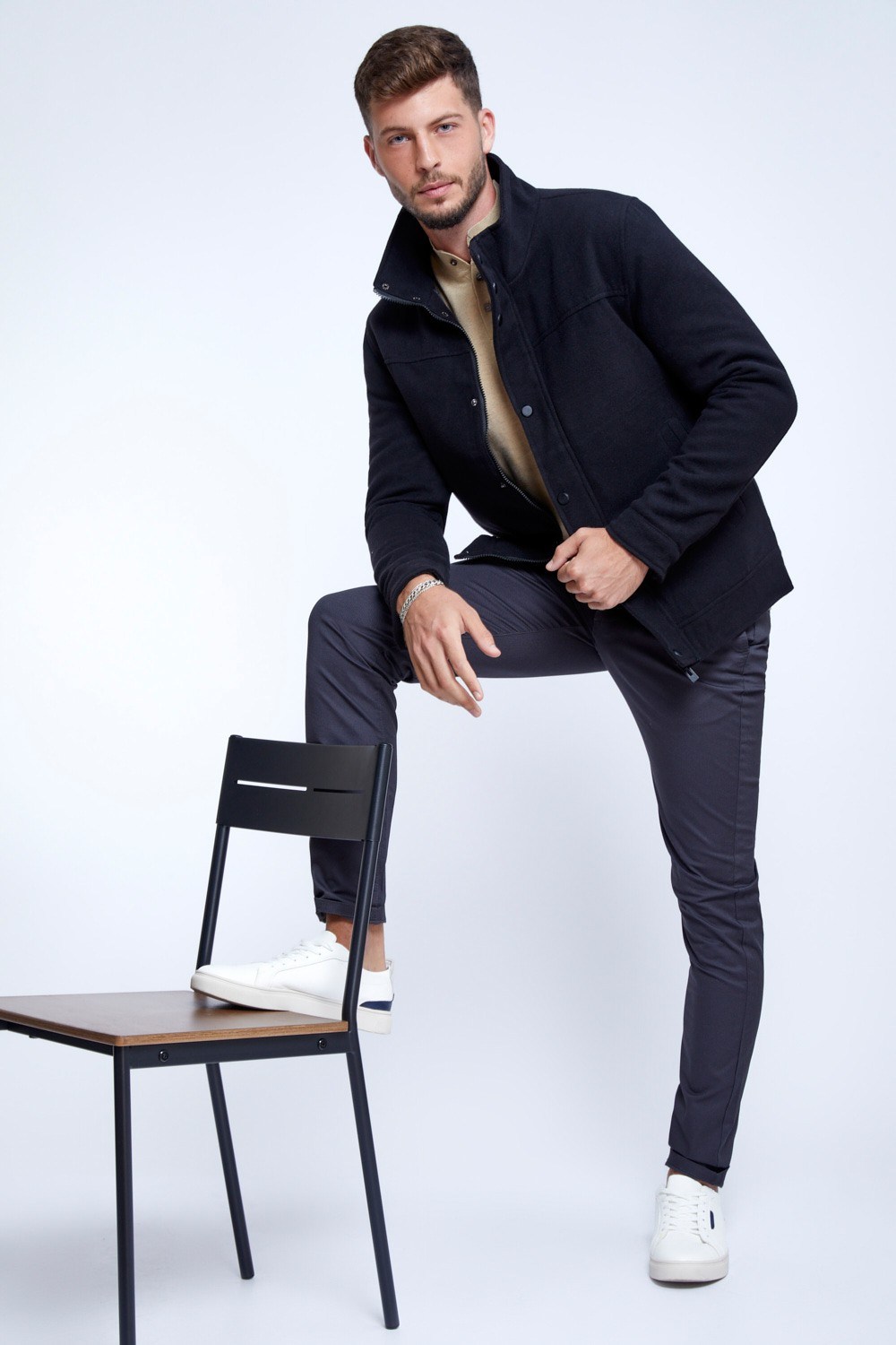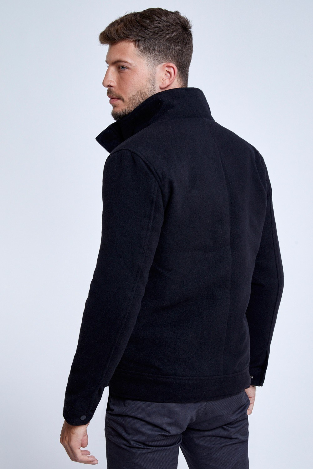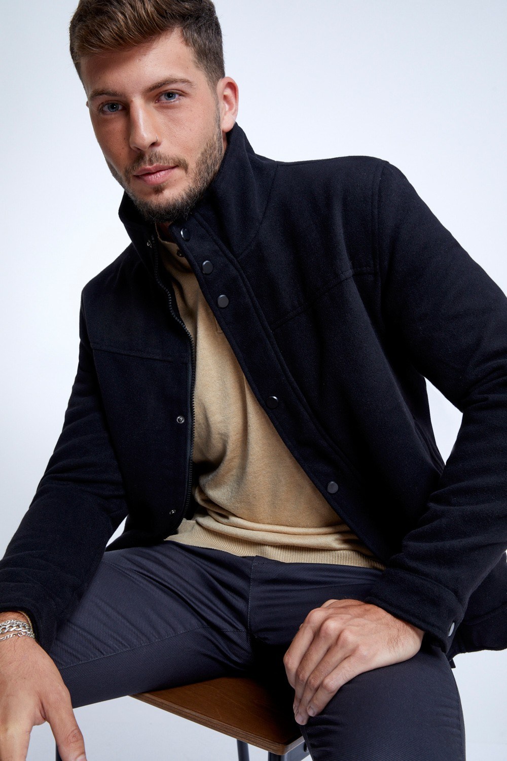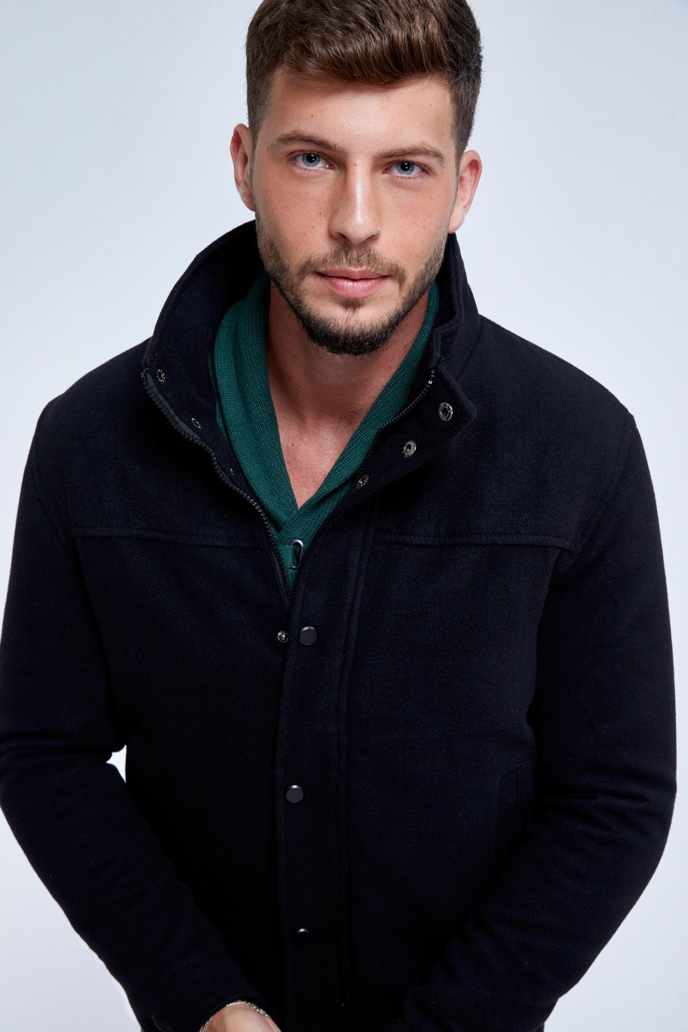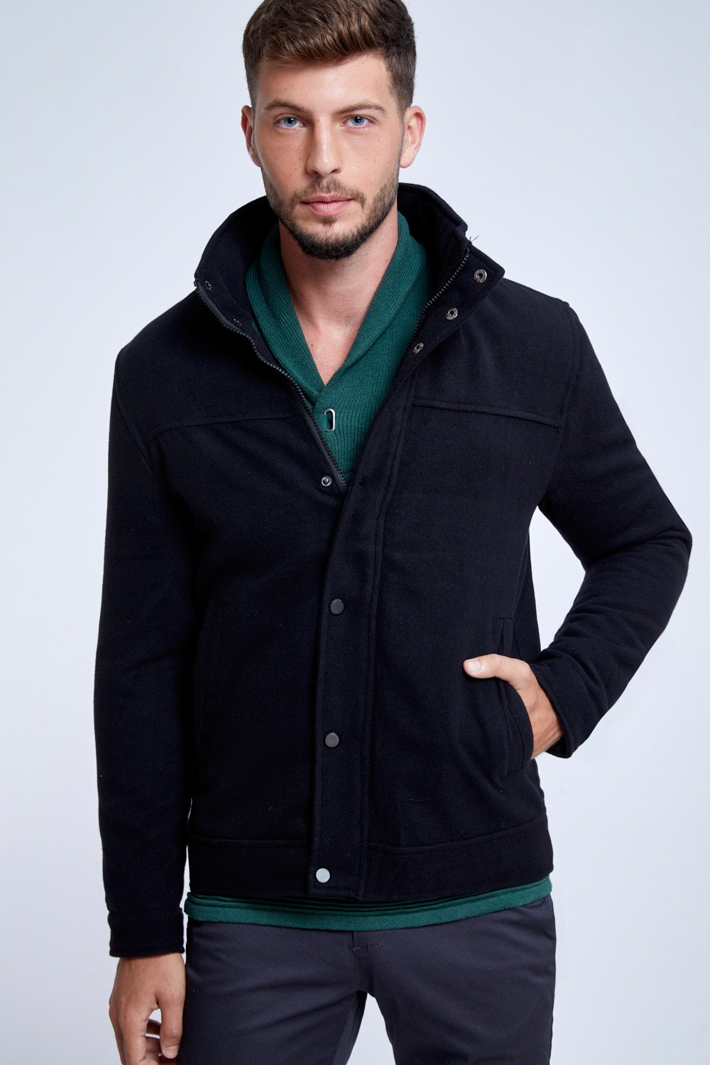 מעיל מהסוג שתמיד מתאים והולך עם ה-כ-ל. מעיל במראה צמר באורך קו החגורה, סגירה כפולה הכוללת גם רוכסן נסתר וגם תיקתקים חיצוניים, שילוב כיסי צד