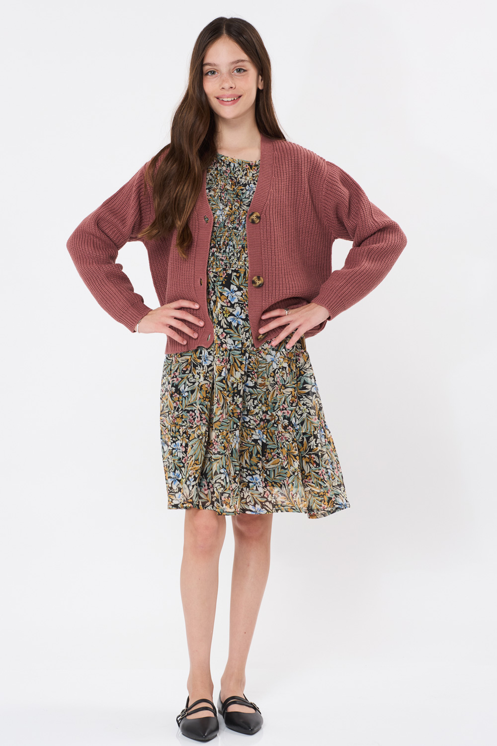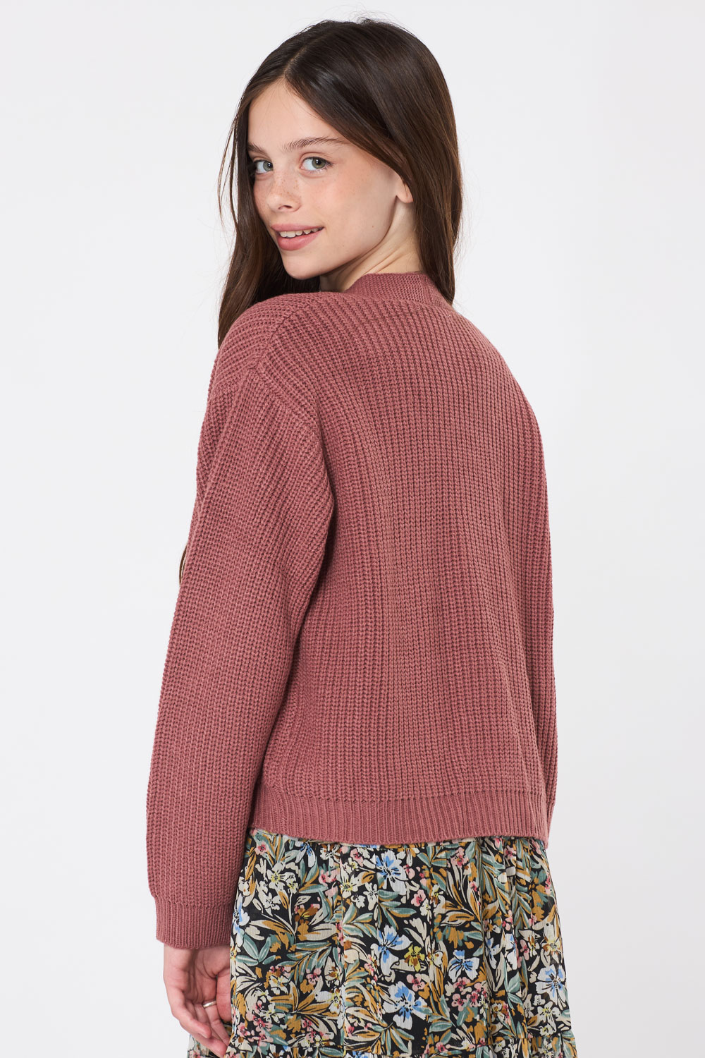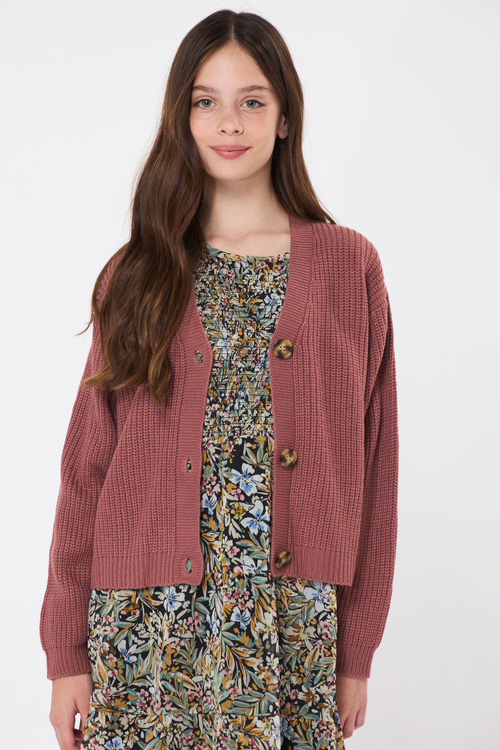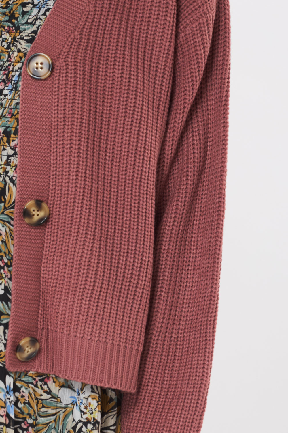 צווארון וי, כפתורים בחזית ושרוולים ארוכים.