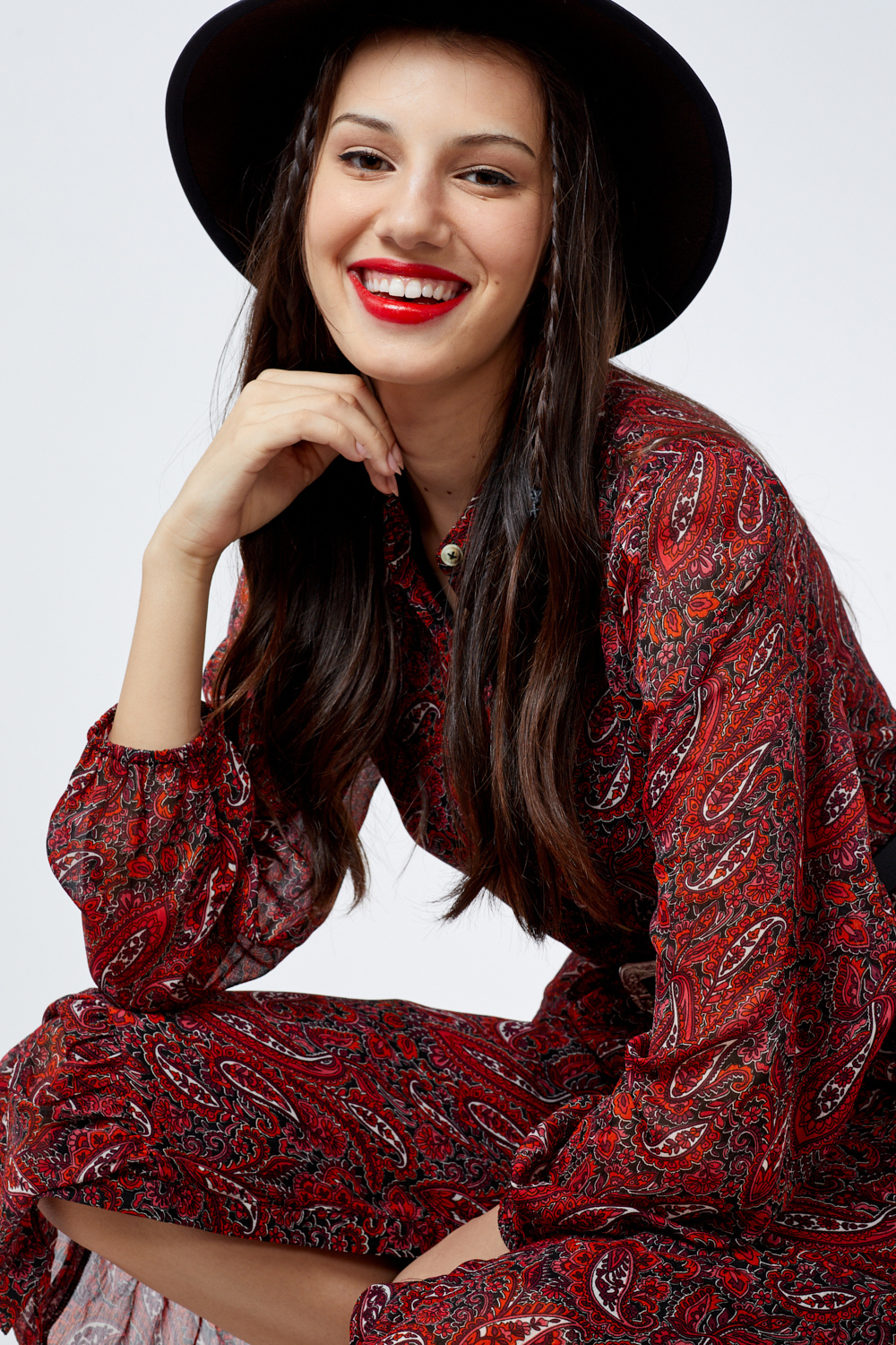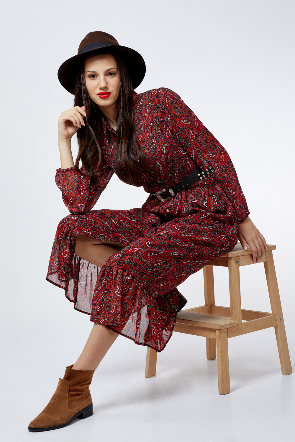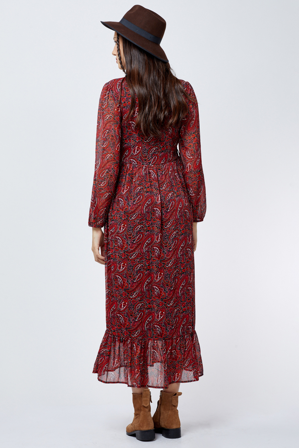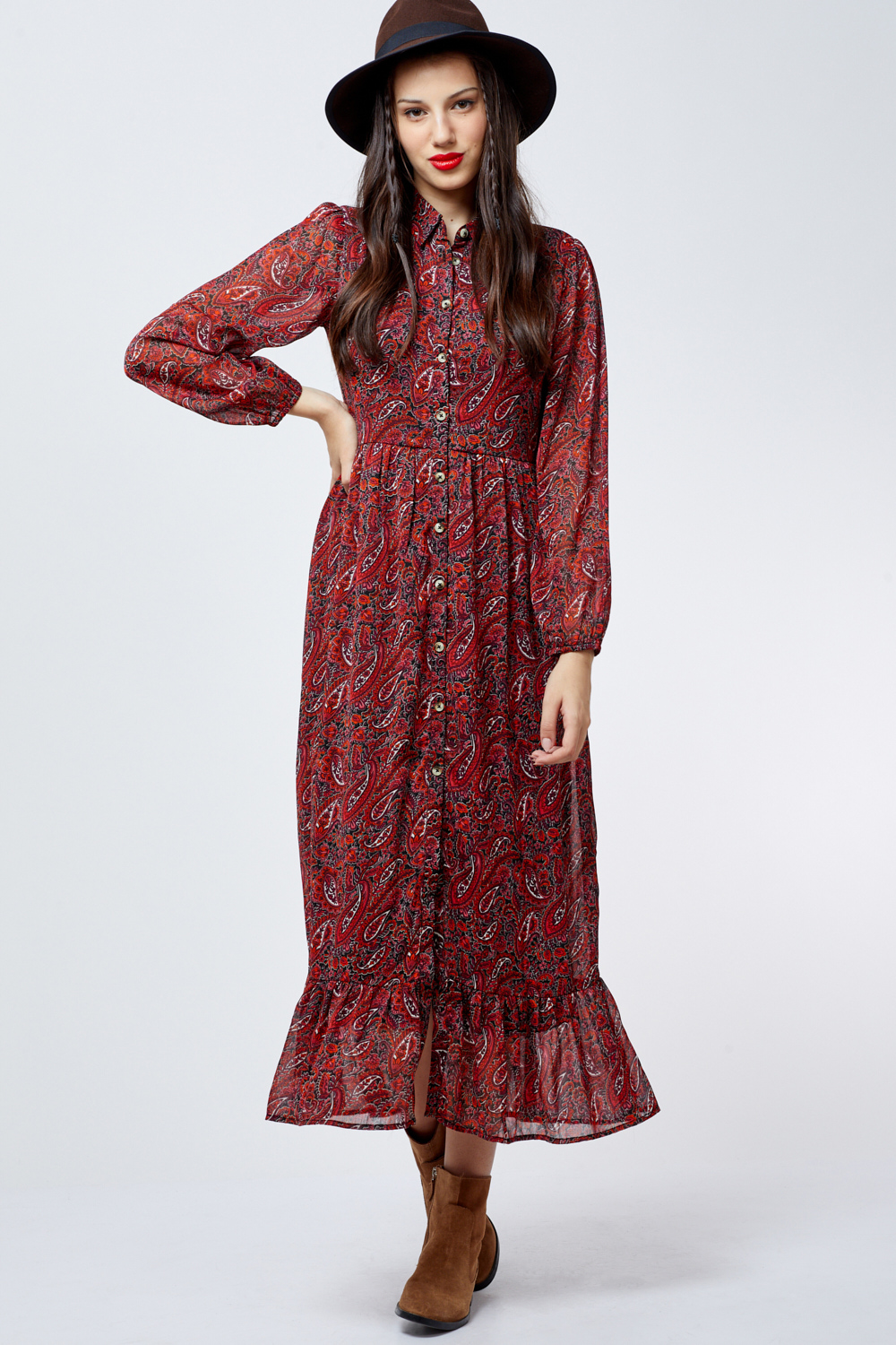 שמלת פייזלי ארוכה מבד שיפון נשפך עם כפתורים לאורכה ניתן לשלב עם חגורת מותן